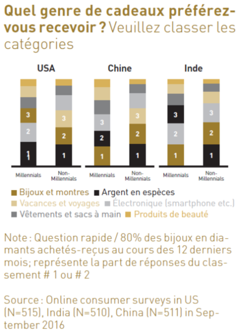 Comme les générations précédentes, la bijouterie (avec diamants) reste dans le top 3 des préférences en termes de cadeau souhaité. Les études révèlent que la Chine et l’Inde se partagent la première place devant les Etats-Unis. D’ailleurs, plus de 70% des Millennials trouvent qu’une alliance doit être ornée de diamant(s), avis davantage partagé que chez les non-Millennials.