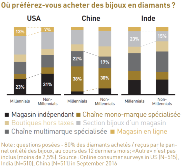 Et dans 10 ans les Millennials seront dans leur stade de vie le plus actif, soit environ 220 millions de consommateurs potentiels aux États-Unis, Chine, Inde et Japon. Ces quatre premiers marchés de bijoux en diamant représentent déjà 73 % de la demande mondiale, aussi le potentiel du marché des Millennials en termes d’achat de diamants, représentait environ 39 % de la population d’achat de diamants en 2015. Il s’agit toujours de la population la plus importante pour les achats de bijoux en diamant.