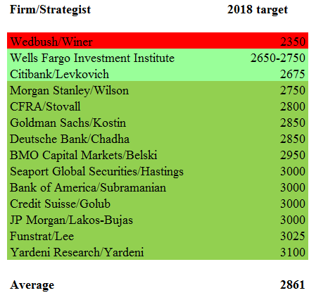 Vous l’aurez compris, hier le S&P500 a battu son douzième record d’altitude de l’année. C’est la première fois de l’histoire de Wall Street que l’indice bat 12 fois un record en 14 jours de trading… Du coup, ça laisse rêveur et les « experts » ont commencé à relever leurs objectifs pour 2018.