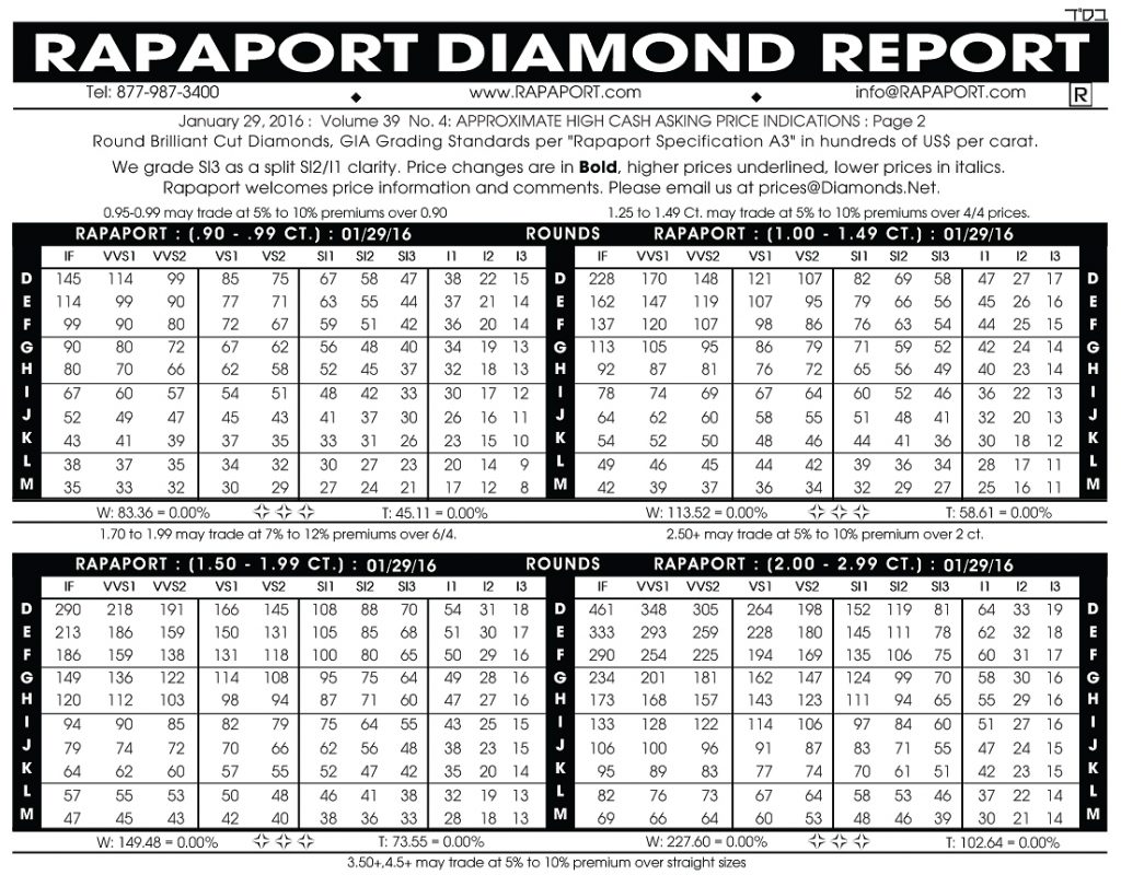 Nous avons vu que les prix des diamants bruts sont principalement basés sur une négociation permanente entre le vendeur qui a ses propres coûts de production et le diamantaire qui fait un calcul inverse des prix attendus des pierres lorsque celles-ci auront été polies. Mais comment pouvons-nous connaitre les prix de ces dernières? Ici, la liste Rapaport, mise à jour et publiée chaque semaine, joue un rôle important. Elle donne essentiellement une indication du prix par carat pour les principales catégories de diamants (formes ronde et fantaisie) et les caractéristiques (carat, coupe, clarté, couleur) jusqu’à 5 cts.