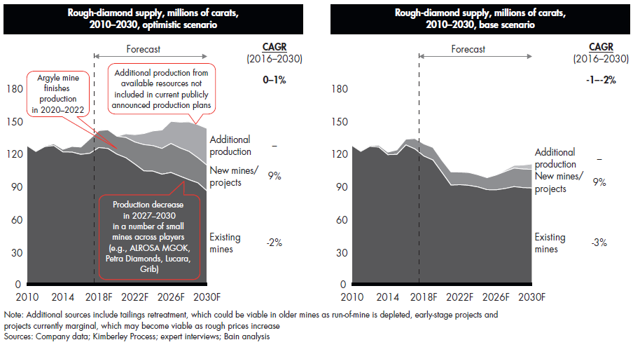 Selon la dernière étude sur le diamant à fin 2017 réalisée par Bain & Co, même dans un scénario très positif, l’offre restera stable. Le scénario de base prédit un lent déclin de la production de l’ordre de 1 à 2%.