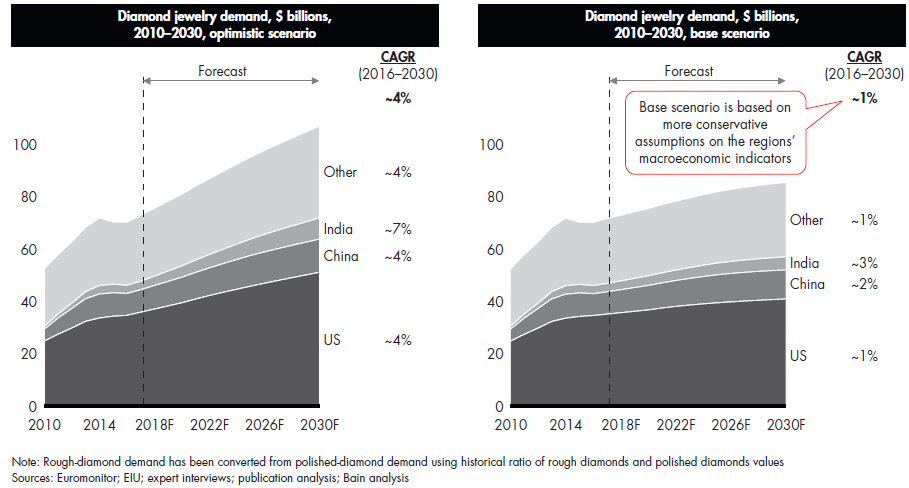 A l’autre extrémité de la chaîne de valeur, on trouve la demande de bijoux, qui devrait croître annuellement à un rythme modeste, atteignant les 80 milliards de USD, dont environ 25 milliards en valeur diamantaire. Les principaux marchés sont les États-Unis, la Chine et l’Inde. Avec la plus forte croissance émanant de ce dernier pays.. De même, la montée des classes moyennes dans les pays émergents leur a donné accès aux diamants, l’un des objets physiques les plus valorisés que l’on puisse posséder dans la plupart des cultures. Il existe peu d’estimations mais nous sommes proches de 75-80 milliards USD.