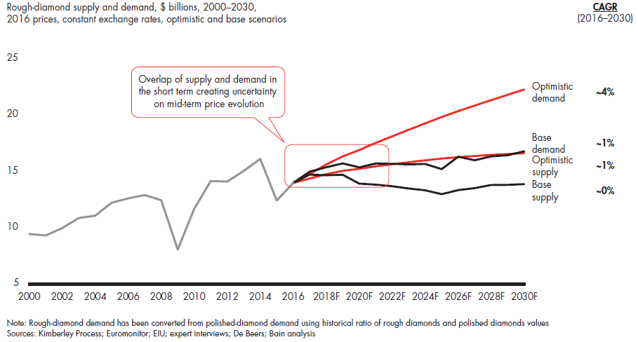 Il en résulte un scénario d’offre et de demande qui est positif pour les prix et relativement prévisible, sachant que la plupart des nouveaux projets miniers mettent beaucoup de temps à se développer et que la demande de diamants évolue globalement en ligne avec le PNB mondial. En effet, De Beers a longtemps étudié quel est le facteur le plus important de la demande, et a démontré une corrélation de plus de 99% avec le PNB mondial.