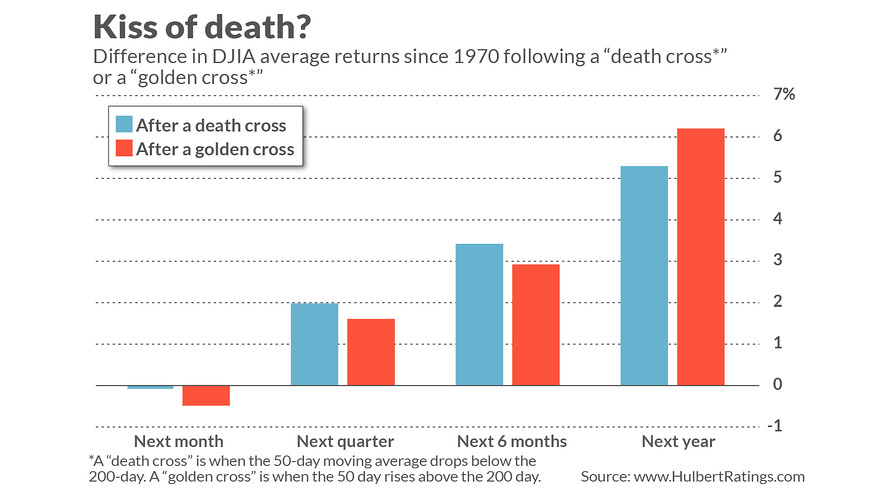 Sauf que quand on regarde les statistiques sur les 50 dernières années, il arrive que la Death Cross entraîne le marché plus bas sur le mois suivant, mais sur le trimestre suivant c’est récupéré et même bien plus haut et dans l’année qui suit, on ne sait plus comment on écrit Death Cross.
