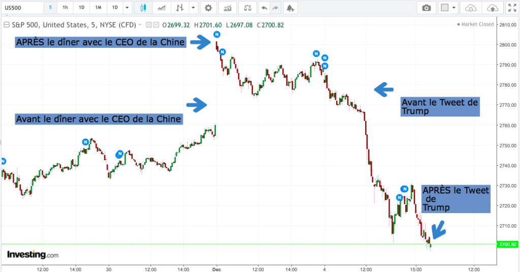 Et pour faire bon poids bonne mesure, Tariff Man s’est lancé dans une série de “tweets” menaçants vis-à-vis de la Chine, laissant entendre que si ça ne se passait pas comme IL VOULAIT lui, les tarifs remonteraient et qu’à la fin il voulait que l’Amérique soit “riche AGAIN”…