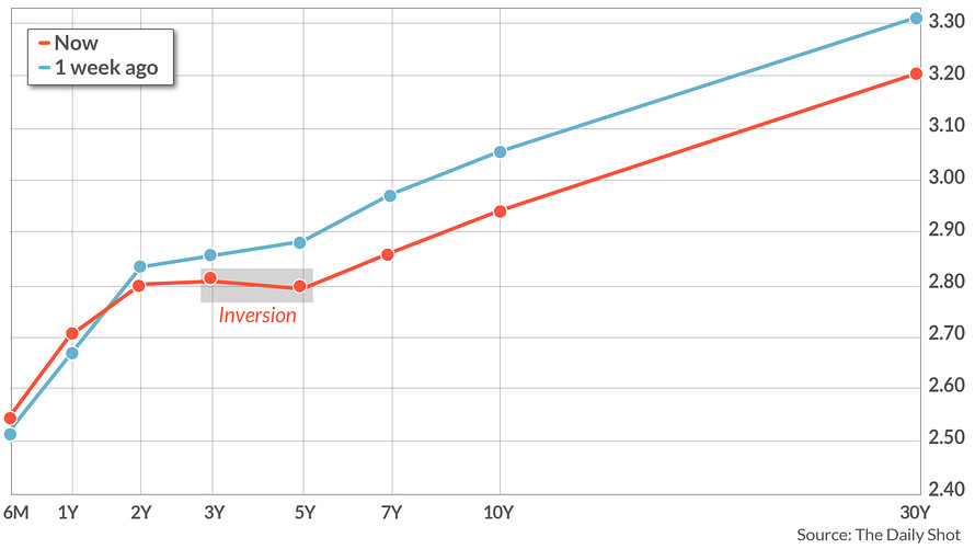 En gros le rendement du 10 ans américain s’est pété la figure violemment hier soir et se rapprochait méchament du rendement du 2 ans. Ils sont au plus près depuis 2007. Un passage du taux à dix ans en-dessous du taux à deux ans est considéré historiquement comme un signe de récession à venir. C’est en tous les cas ce qui a été observé les trois dernières fois.