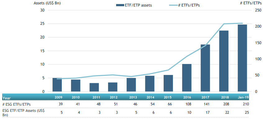 Les ETF labellisés ESG ont atteint fin janvier un nouveau sommet en termes de volumes sous gestion, avec plus de 25 milliards de dollars. Cela reste néanmoins une goutte d’eau dans un marché global des ETF qui a dépassé la barre des 5 trilliards de dollars en 2018.