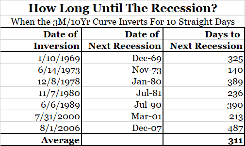Les statistiques sont un peu différentes que dans le premier cas. Dans le cas présent, la récession devrait arriver dans 311 jours. Pour autant que ce signal se répète plusieurs jours de suite. Lorsque l’inversion de la courbe 3 mois/10 ans se répète 10 jours de suite, la récession sera là dans « en moyenne dans 311 jours ». Au plus tôt dans 140 jours au plus tard dans 487 jours.