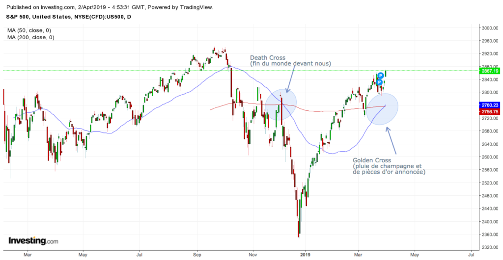 Les graphiques semblent en mode « je casse tout vers le haut ». Hier le CSI 300 a fait un nouveau pas vers l’extermination des « shorts » et le S&P500 termine au plus haut depuis la catastrophe du mois de novembre. L’indice américain avait chuté au moment où la Death Cross se dessinait sur l’indice et aujourd’hui, il est en train de tout casser en montant en affichant une Golden Cross. Comme ça, instinctivement, le S&P500 semble ouvert pour aller battre des plus hauts historiques.