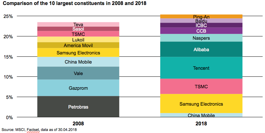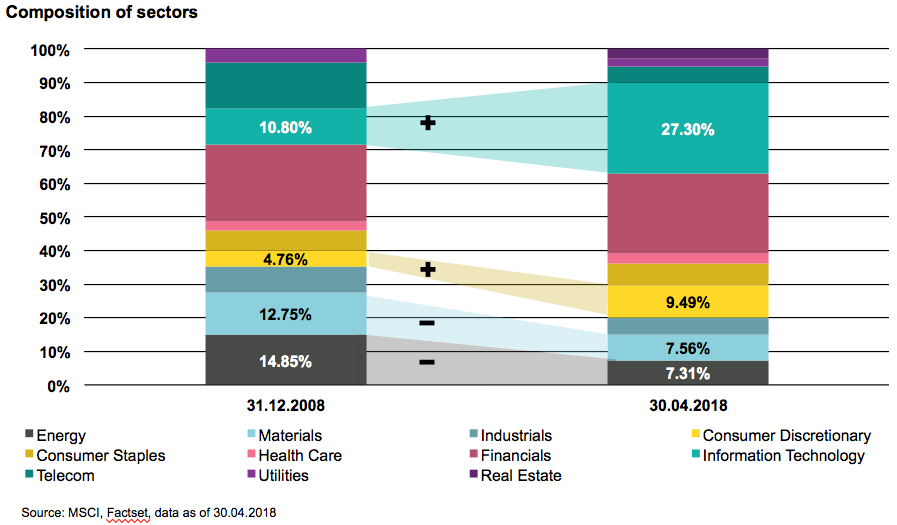 Au cours des dix dernières années, de nombreux pays émergents ont renforcé l’orientation de leurs économies sur les services et la consommation, mettant l’accent sur les produits de haute technologie et les biens de consommation de base. Les mutations structurelles décrites se reflètent également dans la modification de la composition de l’indice de référence des actions.