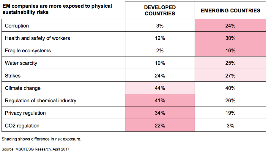 Parmi les entreprises souffrant de pénurie d’eau, 25 % sont situées dans les pays émergents contre 19 % dans les pays industrialisés. Il n’est donc pas surprenant que le nombre des entreprises exposées à des risques de durabilité soit nettement plus élevé dans les pays émergents que dans les pays développés.