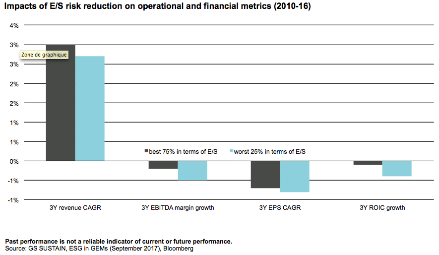 Une comparaison des chiffres relatifs à la marche des affaires des entreprises durables montre que la croissance du chiffre d’affaires, les marges et la croissance du bénéfice par action sont généralement plus élevées pour les entreprises plus durables que pour celles présentant les notes ESG les plus défavorables.