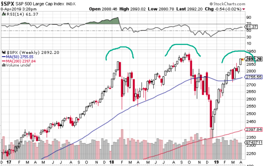 Un autre thème qui revient régulièrement ces dernières heures et qui vient du fait que l’on pas entendu de news du Trade Deal depuis 36 heures, c’est le fait que le marché est à un point d’inflexion et qu’après son rebond de 23% depuis décembre il pourrait bien être au bord de se péter la gueule, sans compter qu’en observant des charts qui représentent le S&P500 en weekly avec un MAGNIFIQUE triple top, il n’y a qu’un pas à faire. Un pas qui donne envie de se lancer dans le base-jump, puisqu’il semble évident que le krach est à nos portes.