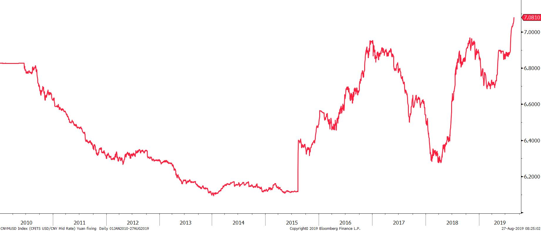 Le yuan a atteint son plus bas niveau depuis 11 ans et le panier du yuan pondéré par les échanges commerciaux a atteint son niveau le plus bas depuis 2014. Cette dépréciation reflète l’inquiétude suscitée par l’économie chinoise dans un contexte de guerre commerciale durable. Bien que le renminbi s’affaiblisse, il n’est pas en chute libre. La PBoC devrait intervenir si l’affaiblissement venait à s’accélérer. Jusqu’à présent, elle a publié un fixing plus élevé que le taux de clôture de la veille afin de montrer qu’elle ne souhaite pas un affaiblissement marqué.