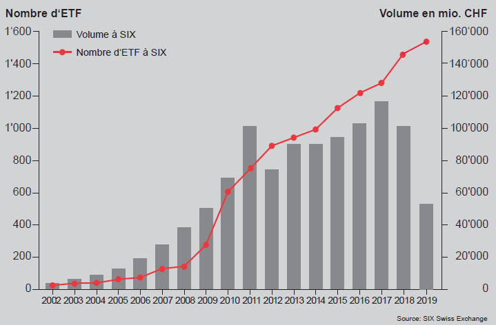 Le chiffre d’affaires global à la SIX Swiss Exchange s’est élevé au cours du 1er semestre à 53,3 milliards de francs, soit une légère baisse par rapport au volume semestriel de l’année précédente (57,0 milliards). Fin juin 2019, 1535 ETF de prestataires de produits différents étaient cotés à la SIX Swiss Exchange, soit une augmentation de 166 produits par rapport à l’année passée.