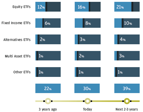 La majorité des produits entrent dans la catégorie des actions des marchés développés, avec de plus en plus de fonds du segment obligataire. Si l’on considère les chiffres d’affaires du 2e trimestre classés par catégories d’actifs, les actions des marchés développés occupent clairement le 1er rang, à 63,8%. Les ETF des pays émergents arrivent en 2e position (8,7%), précédant de peu les matières premières (7,4%). Les actions thématiques sont à la 4e place (7,1%), et les offres obligataires à la 5e, avec 6,6%. Des chiffres que l’on peut mettre en parallèle avec une récente étude de JP Morgan sur l’attrait des ETF au niveau global (graphe).