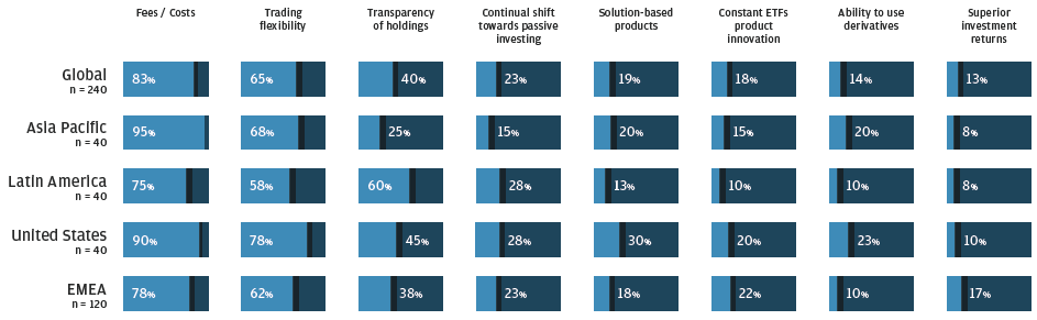 Toujours selon l’étude de JP Morgan, les investisseurs en ETF – quelle que soit leur zone géographique – cherchent en premier lieu à abaisser leurs coûts mais sont égalment intéressés par la flexibilité et la transparence offertes par ce type d’instrument.