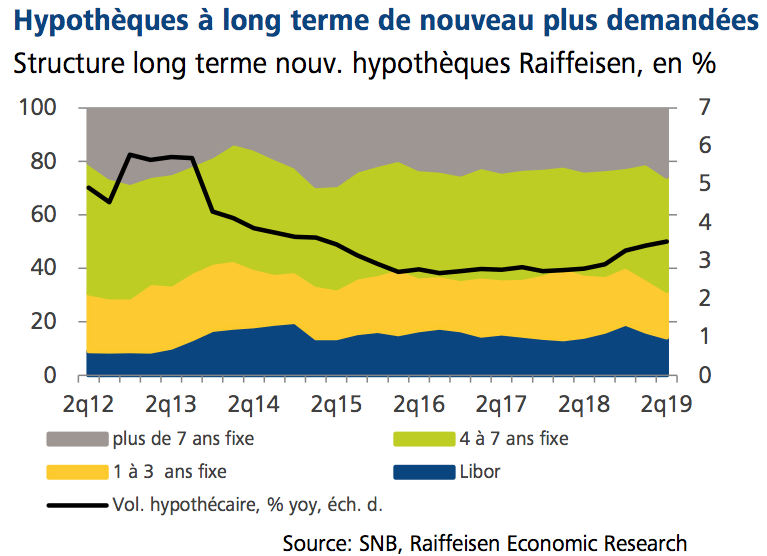 Mais toute médaille a son revers. Les taux hypothécaires restent ainsi stables, proches des plus-bas record. L’aplatissement de la courbe des taux a comme conséquence qu’il n’y a pratiquement plus de différences entre les taux pour les différentes échéances. Les experts de la Raiffeisen constatent que la tendance des hypothèques aux échéances plus longues se prolonge. Les hypothèques fixes avec une échéance de plus de 7 ans ont récemment été particulièrement demandées.