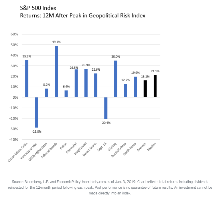 Pourtant, si l’on regarde les statistiques, c’est pas si moche que ça. Tout d’abord ne dit-on pas : « achetez au son du canon et vendez au son du clairon » ??? Et puis ensuite, si l’on regarde les dernières fois que l’on a parlé « guerre » et que ça a vachement chauffé derrière, dans les 12 mois qui ont suivi, les marchés sont montés en moyenne de 16% – si l’on en croit les données compilées ci-dessous par Invesco.