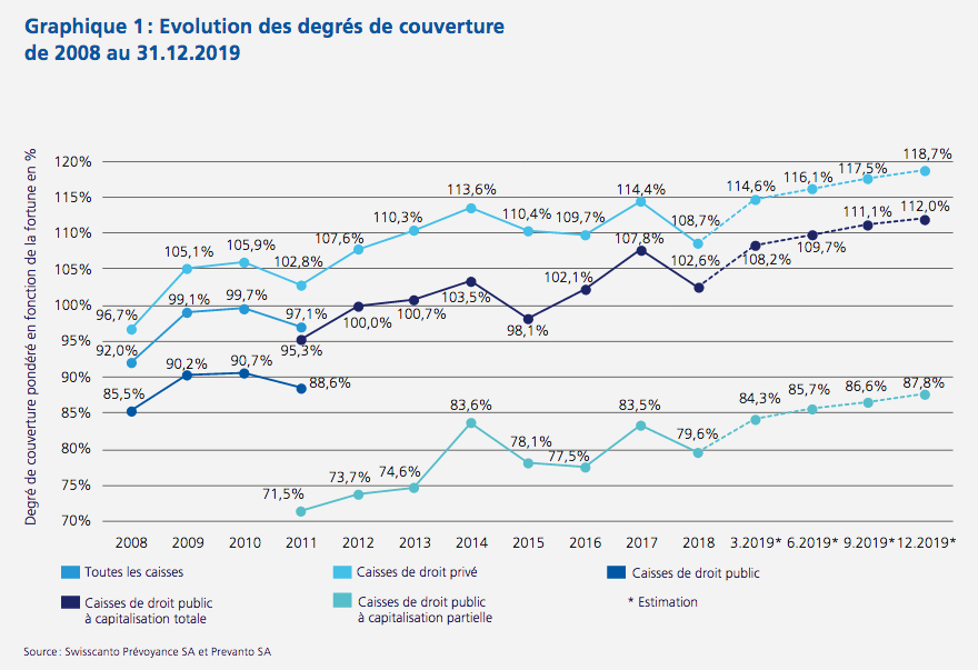 L’année passé a vu les réserves des institutions de prévoyance privées sont passées de 8,7% à 18,7%. Donc, avec 118,7% les degrés de couverture ont atteint un plus haut historique. Les institutions de prévoyance de droit public à capitalisation totale ont aussi vu leur degré de couverture en hausse. Celui-ci s’établit à 112%.