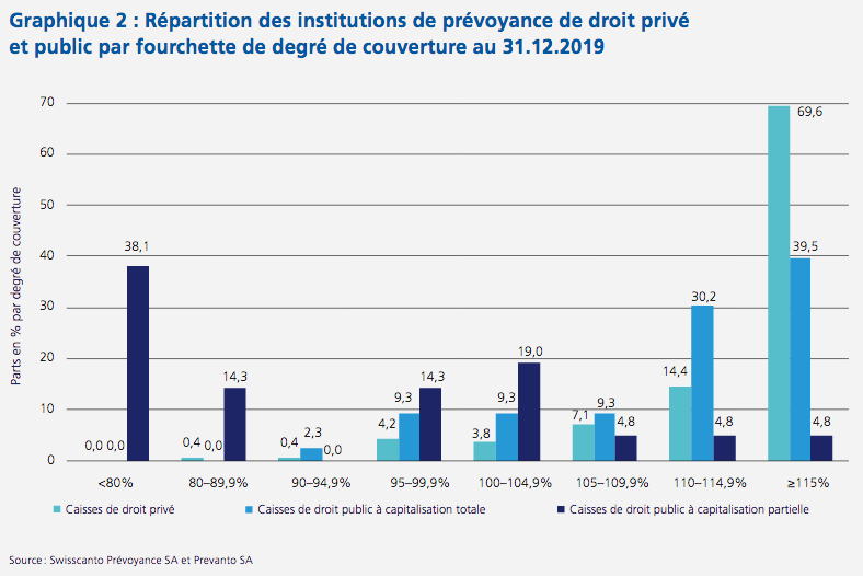 Fin 2019, environ 70% des institutions de droit privé affichent une couverture de plus de 115% contre environ 40% des institutions de droit public.