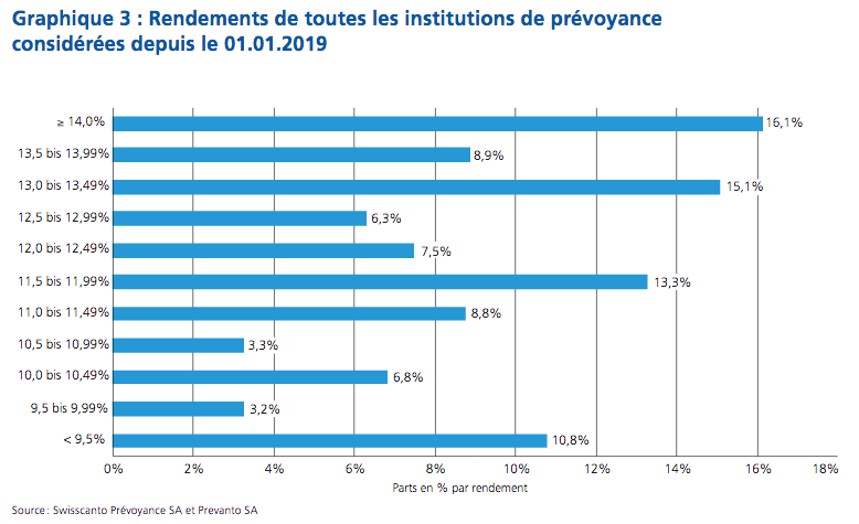 Le graphique suivant présente la répartition des rendements cumulés estimés sur l’année 2019. Plus de 60% des institutions de prévoyance ont réalisé un rendement supérieur à 11,50%.