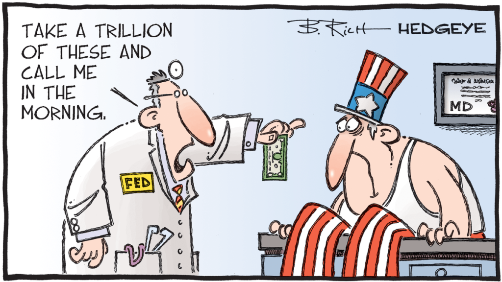 Puis, la FED a annoncé qu’ils lançaient un QE. Un nouveau Quantitative Easing. La FED avait déjà annoncé un QE de 750 milliards il y a une semaine. Mais là, comme le marché n’avait pas apprécié la chose, la FED s’est dit que le marché n’avait pas apprécié parce qu’il n’y avait pas assez. Alors la FED a inventé un nouveau truc, le QE ILLIMITÉ !!! Alors là c’est clair personne ne peut dire que c’est pas assez, puisque c’est ILLIMTÉ. À l’annonce de cette nouvelle le marché a continué à baisser encore plus.
