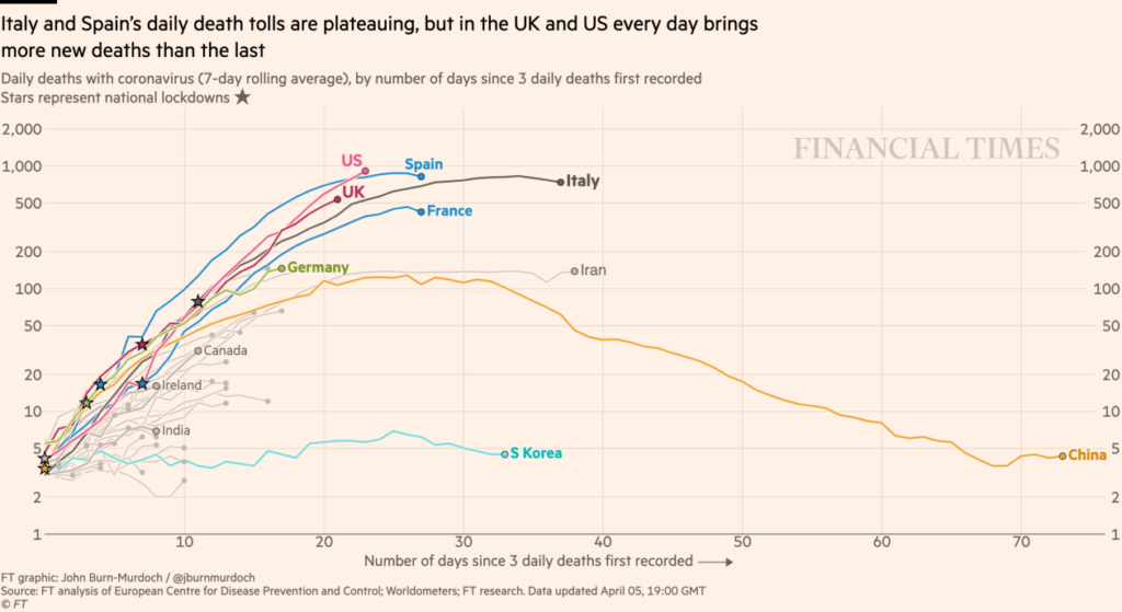 Aujourd’hui il y aura plein de chiffres comme le chômage en Suisse, même si personne ne bosse en ce moment. La France publiera son « Trade Balance » même s’ils n’exportent et n’importent plus rien en ce moment – si ce n’est des masques – et puis il y aura les JOLTS aux USA, mais franchement on est bien plus plongé dans l’interprétation des courbes logarithmiques de la propagation du virus que dans les courbes des indices boursiers – c’est une analyse technique différente, mais on fait avec ce que l’on a – et puis si ça peut nous permettre de monter les tous les jours de 7%, je crois que l’on va se contenter de cela et de brasser de l’air. D’ailleurs brasser de l’air ça aide à propager le COVID19, mais c’est quand même ce que l’on fait de mieux en ce moment.