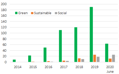 Depuis février 2020, des «obligations pandémiques» ont vu le jour. Cette appellation qualifie les obligations qui ont pour objet de financer les efforts de relance. La China Merchants Bank a été la première à lancer une telle émission en février 2020, suivie de la Bank of China et d’autres institutions et agences chinoises en mars. Le principal émetteur a été le gouvernement espagnol avec une obligation à 10 ans de 15 milliards qui a été portée à 21 milliards. Le gouvernement indonésien a également émis 3 obligations pour 4,3 milliards de dollars en avril. Les émissions gouvernementales soulignent la définition très large du segment. De manière naïve, on pourrait considérer que la plupart des dernières émissions gouvernementales représentent un effort pour financer la reprise.