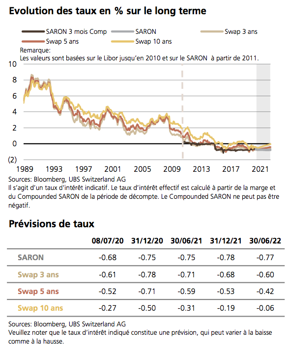 Les experts d’UBS constatent que malgré un fléchissement de l’économie réelle, les taux d’intérêt suisses ont grimpé pendant le premier semestre 2020 par rapport à la même période en 2019. Il faut tout de même voir que malgré cette « hausse », les taux restent en territoire négatif.