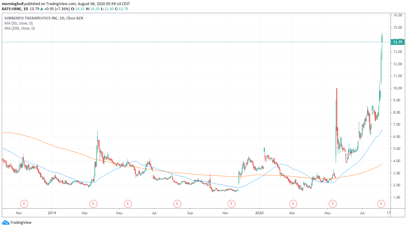 Bon, là je m’emballe un peu, mais je crois que le marché est en train de perdre le sens des réalités. Ça arrive parfois, on l’a déjà vécu. Le problème c’est que ça a souvent tendance à durer et que l’on ne sait pas quand ça s’arrête, ni comment. Donc pour l’instant on surfe la vague, on cherche les bonnes nouvelles et on s’y accroche et si on a un peu peur, c’est pas grave ; on achète de l’or et on se dit que c’est la solution miracle à toutes les corrections boursières. Et je ne rigole pas quand je dis que l’on « cherche » les bonnes nouvelles, regardez ce qu’a fait l’action Sorrento Therapeutics hier. La société a annoncé qu’ils ont développé un test salivaire pour le COVID qui vous donne une réponse en 30 minutes – l’annonce a été faite il y a une semaine. Le titre a pratiquement doublé depuis. Tous les jours le titre prend 10% environ POUR LA MÊME NOUVELLE !!! Nouvelle positive, soit, mais c’est LA MÊME.
