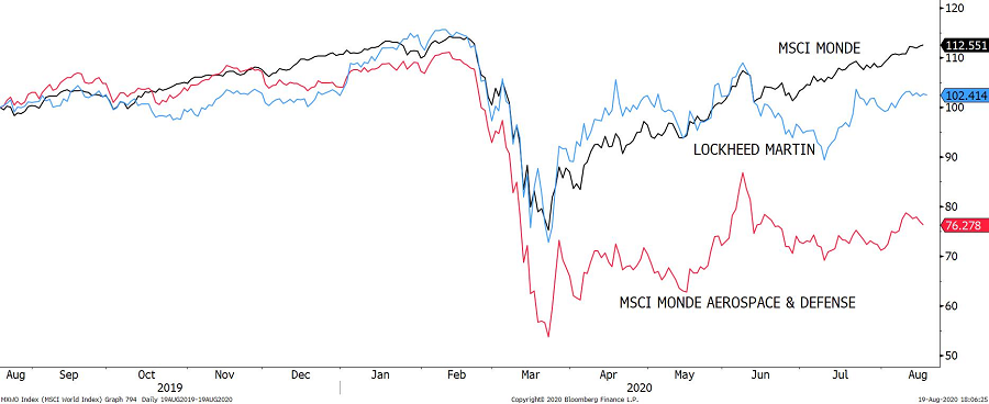 Les deux poids lourds de l’aviation commerciale, Boeing et Airbus, ont perdu 47% chacun. Si l’aviation commerciale souffre évidemment de la crise pandémique, les sociétés pures dans les équipements militaires et de la défense se sont beaucoup mieux comportées. Il faut dire que la situation géopolitique est tendue.