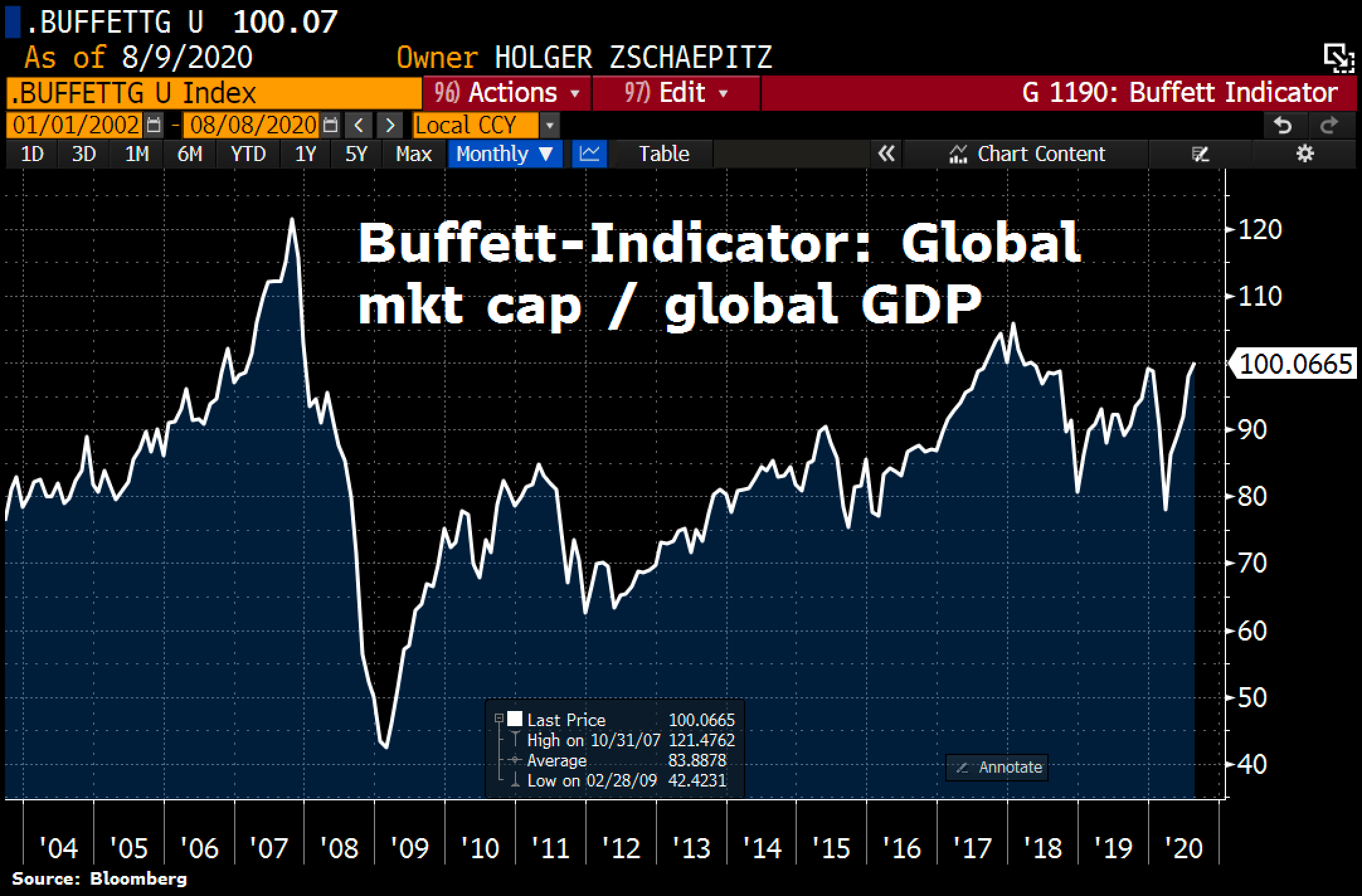 Par contre, on a trouvé autre chose qui fout les jetons. En 2001, Warren Buffet avait donné une interview dans laquelle il expliquait clairement que si les investisseurs s’étaient donné la peine d’observer UN SEUL INDICATEUR en 2000, ils auraient vu venir le Krach. Cet indicateur c’est la somme de toutes les capitalisations boursières par rapport au PIB. Lorsque la somme atteint 80% du PIB, il faut acheter et lorsque la somme de toutes les capitalisations dépasse les 100% du PIB, il faut tout vendre. Hier nous avons atteint les 100% du PIB. Sauf que dans l’histoire, on peut voir que – comme d’habitude, et vous le voyez sur le graphique ci-dessous – il y a des emballements à la hausse qui ont tendance à durer… avant de revenir à la normale, les 100% du PIB ne sont pas un mur. Bref, si vous cherchiez une nouvelle pour vous faire peur ce matin, je viens de vous la livrer.