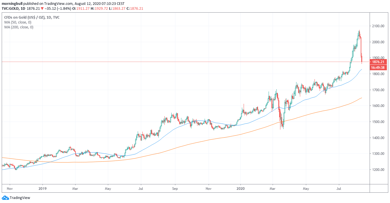 Mais si l’économie repart, il va y avoir de l’inflation, on va devoir monter les taux, investir dans l’obligataire sera à nouveau une solution. D’ailleurs le rendement du 10 ans américains vient de remonter à 0.65%, n’est-ce pas une opportunité inouïe d’investir avec des rendements pareils ? 0.65% par année, c’est presque la performance de Tesla cette année – à 400% près. Du coup, les marchés américains ont commencé à douter. Mais l’or aussi a commencé à douter. Oui parce que si Poutine sauve le monde avec son vaccin et nous débarrasse à lui tout seul de cette merde, il n’y aura plus jamais besoin d’or comme valeur refuge. Le métal jaune s’est donc offert sa pire journée depuis 7 ans. Vendredi dernier nous étions à 2075$ au plus haut de tous les temps et à l’heure où je vous parle, on frise les 1900$. Ça fait quand même 10% en quelque jours. Bon, je vous rassure tout de suite, les convaincus de l’or à 4’000$ estiment que vous êtes en train d’assister à l’opportunité d’achat de toute une vie, on vous conseille largement de casser la tirelire du petit dernier pour tout mettre en or, parce qu’une fois que le métal jaune aura consolidé entre 1900 et 1950, il va repartir tellement vite, tellement haut que vous ne le verrez même pas passer.