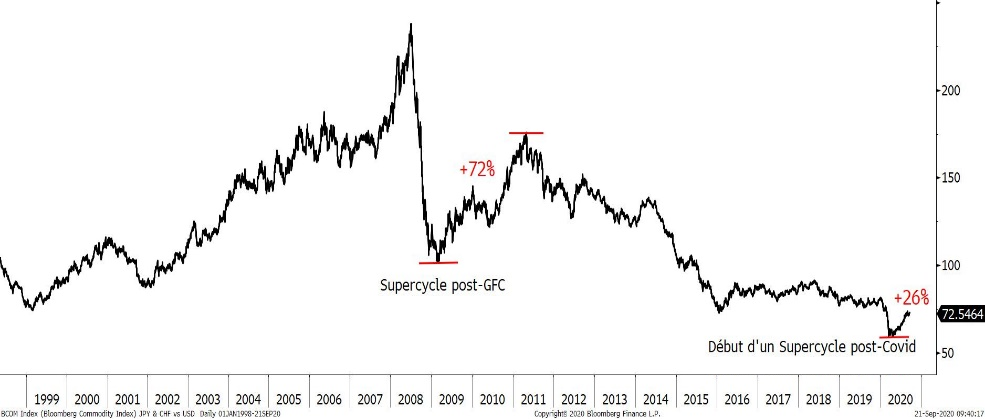 La réponse des banques centrales au Covid a été l’écrasement des taux d’intérêt et l’injection de gigantesques liquidités, alors que les gouvernements apportent une réponse fiscale. En 2021, les gouvernements devraient investir massivement dans l’infrastructure. Après la crise financière (GFC) de 2008, les matières premières avaient déjà connu une période de forte reprise grâce aux mesures de relance.