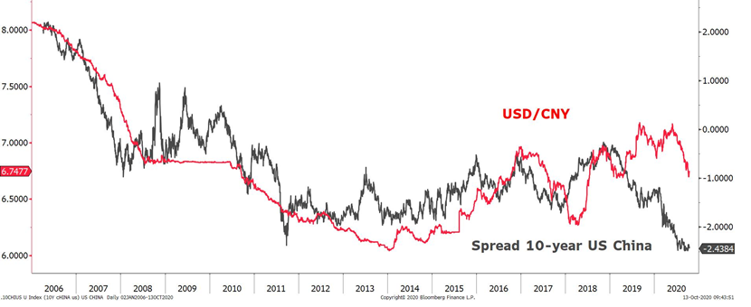 La force actuelle du yuan n’est pas uniquement due à une faiblesse du dollar. Des facteurs domestiques continuent de militer en faveur d’un renforcement de la devise chinoise. La PBoC, à l’inverse des grandes banques centrales des pays développés, a adopté une fonction de réaction de sa politique monétaire nettement plus prudente. Elle ne s’est pas lancée dans une série de baisses des taux directeurs ou le lancement de programmes d’achat d’actifs à grande échelle. Le momentum économique porteur, le différentiel de taux favorable et les flux de capitaux à venir avec l’intégration de plus en marquée des obligations chinoises dans les grands indices mondiaux sont autant de facteurs de soutien.