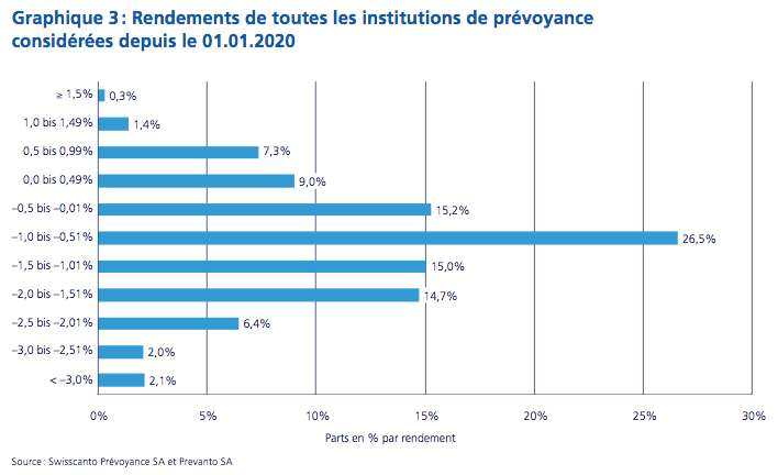 Au 3ème trimestre la performance moyenne observée dans les caisses de pension chez ZKB est de 1,98%. Grâce à elle, les réserves en pourcentages des caisses se situe à 11,1% contre 9,6% le trimestre précédent. Ainsi, les institutions de prévoyance ont compensé environ les trois quarts de la perte de couverture subie depuis fin 2019.