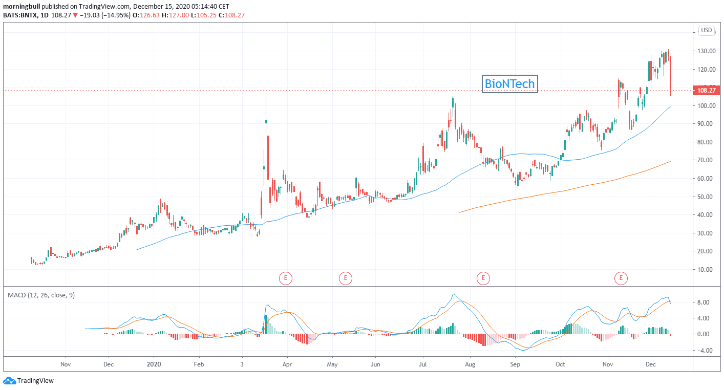 Donc hier le vaccin de Pfizer/BioNTech a pris place sous les projecteurs parce qu’il est FINALEMENT LÀ. Finalement on va pouvoir passer à la pratique et plus à la théorie. Il est d’ailleurs assez étrange de voir comment on s’est emballé lorsque l’on a annoncé l’arrivée du vaccin. Je n’ai pas besoin de vous rappeler la journée de folie que l’on a vécu ce « fameux » lundi. Mais aujourd’hui il est fascinant de voir comment, lorsque l’on entre enfin dans la partie « pour de vrai », comment le marché se dégonfle et se désintéresse de la chose. Pourtant si ce vaccin fonctionne et en plus avec l’arrivée de celui de Moderna dans les jours qui viennent, on devrait concrètement se diriger vers un ralentissement de l’épidémie et même, à terme, sa disparition totale. Malgré cet espoir, hier les intervenants ont vendu massivement Pfizer/BioNTech comme pour ne pas faire mentir l’adage boursier qui dit « achetez la rumeur et vendez la nouvelle ». Les deux titres que l’on a montrés comme étant les sauveurs du monde se sont fait laminer proprement hier.