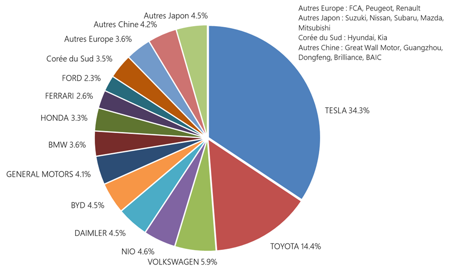 Les capitalisations boursières de Tesla ($555 milliards) et de Nio ($62 milliards) sont extraordinaires comparées aux $227 milliards de Toyota ou $93 milliards de Volkswagen. Les ventes de Tesla se situent à $30 milliards et celles de Nio à $2.4 milliards, comparées aux $245 milliards de Toyota ou aux $261 milliards de Volkswagen.
