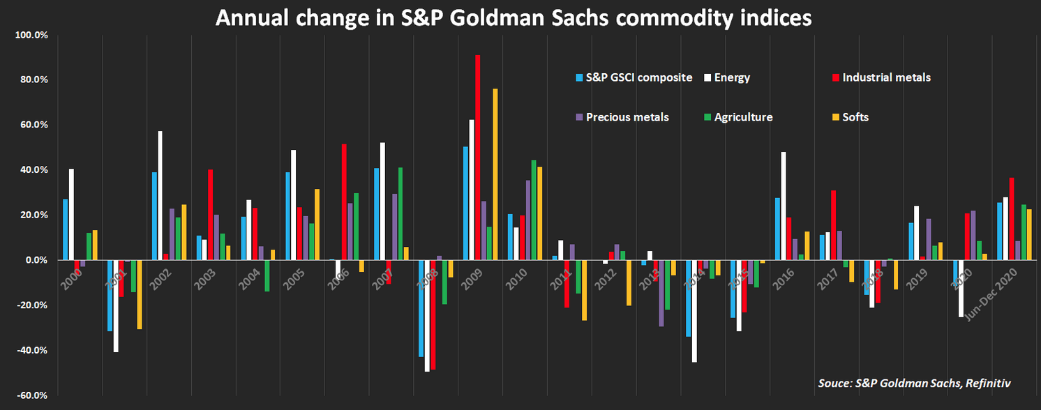 La dernière fois que l’indice des métaux industriels a été en tête du classement annuel des indices S&P GSCI, c’était en 2017, lorsque l’économie mondiale a connu son rythme de croissance le plus rapide depuis 2010 et que des réductions agressives de la capacité excédentaire du principal producteur de métaux, la Chine, ont alimenté une large reprise des métaux de base. Auparavant, les métaux industriels avaient notamment surpassé les autres secteurs des matières premières en 2009, alors que l’économie mondiale se remettait de la crise financière mondiale.
