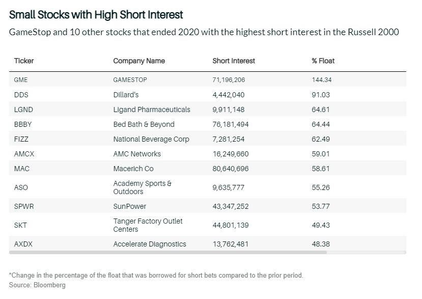 Ce matin, l’Asie, le pétrole, l’or et le Bitcoin ne font rien. Forcément on est bien trop occupé à chercher le prochain GameStop et la liste est déjà sortie. Ceux qui ont compris le concept se sont simplement jeté sur les titres les plus shortés aux USA et ceux qui ont le « free float » le plus faible. On peut donc imaginer que les prochains titres que vont cibler les gars de WallStreetBets et tous ceux qui vont devenir leurs émules se trouveront probablement dans la liste ci-dessous :
