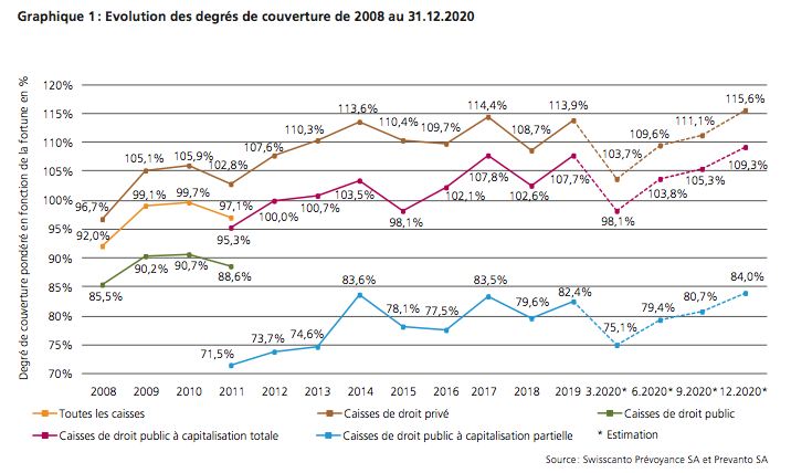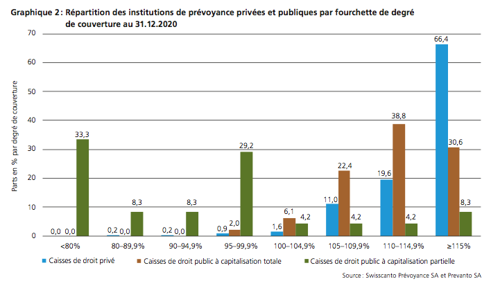 Selon le l’étude, 98,6% des institutions de prévoyance privées affichent une couverture de plus de 100% a fin 2020. Le pourcentage est pratiquement le même dans l’univers des caisses de droit public à capitalisation totale.