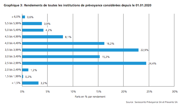Le graphique suivant montre la répartition des rendements cumulés estimés. En 2020, environ 95% des institutions ont réalisé un rendement d’au moins 2,5%. Mais environ 40% des caisses ont un rendement inférieur à la moyenne annuelle de 3,59%.