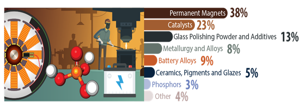 Dans les années 2000, la Chine comptait pour 90% de la production mondiale, mais dès 2008, les autres producteurs mondiaux sont revenus en raison de l’importance croissante des terres rares dans les nouvelles technologies, des restrictions chinoises sur les exportations pour renforcer leur monopole et de la hausse des prix. Aujourd’hui, la Chine compte pour 62% de la production mondiale.