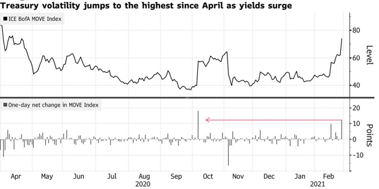 L’inquiétude revient, comme l’illustre le coût de la garantie/ protection des portefeuilles d’obligations, c’est-à-dire l’indice Move. Il s’était effondré à la suite de la pandémie l’année dernière. Mais la résurgence de la fébrilité des marchés obligataires américains, et pas seulement à l’extrémité très longue de la courbe, change la donne. C’est clairement visible avec la forte hausse de l’indice en quelques jours seulement.