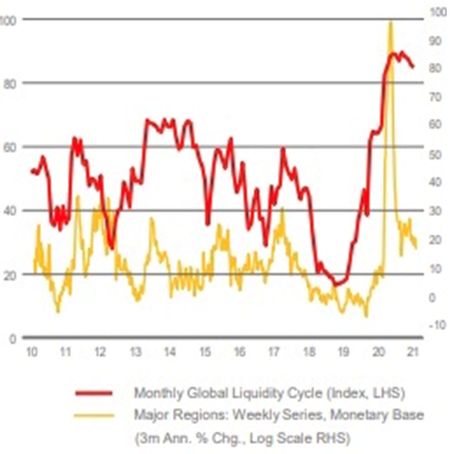 Il est intéressant de noter qu’au cours des deux derniers mois, l’indice plus étroit du G4 a nettement décéléré. L’indicateur global donne aussi des signes de lente décélération, dans le sillage d’une Chine moins accommodante. Jusqu’à présent, cet excès de liquidités avait essentiellement inondé les marchés financiers, d’autant plus dans le contexte de la récession de 2020. Mais un nouveau régime est peut-être en train de se mettre en place. En effet, le rebond économique absorbera les liquidités qui inondaient les marchés financiers.