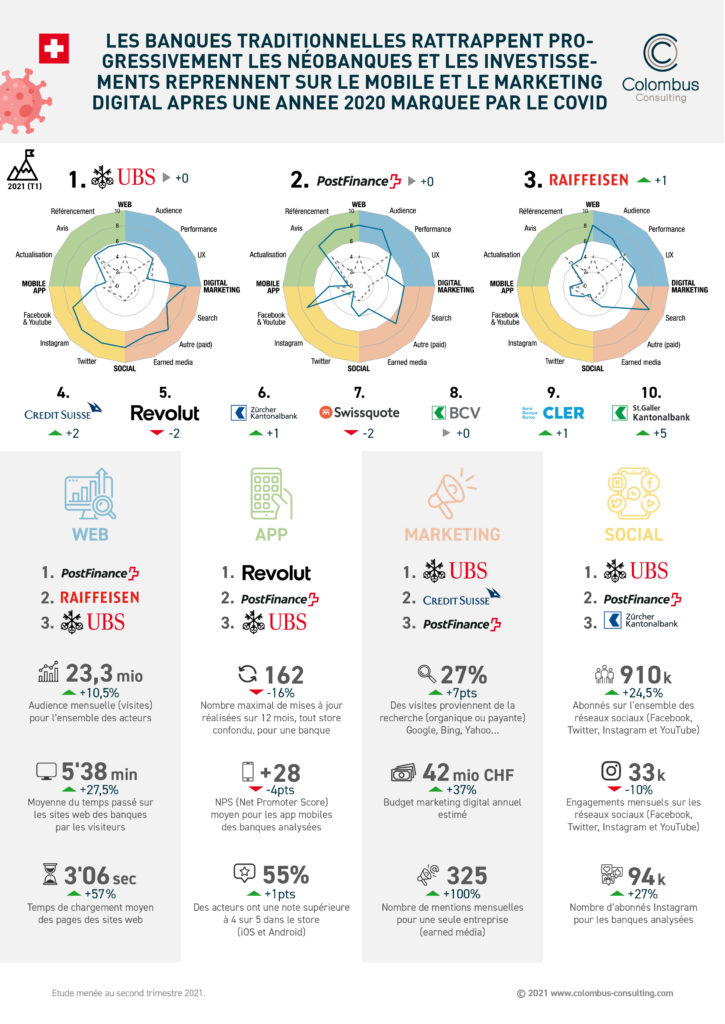 - UBS (1er) et PostFinance (2ème) confirment leur position en tête de classement, Raiffeisen (3ème) gagne une place, Credit Suisse (4ème) en gagne deux, tandis que Revolut (5ème) en perd deux