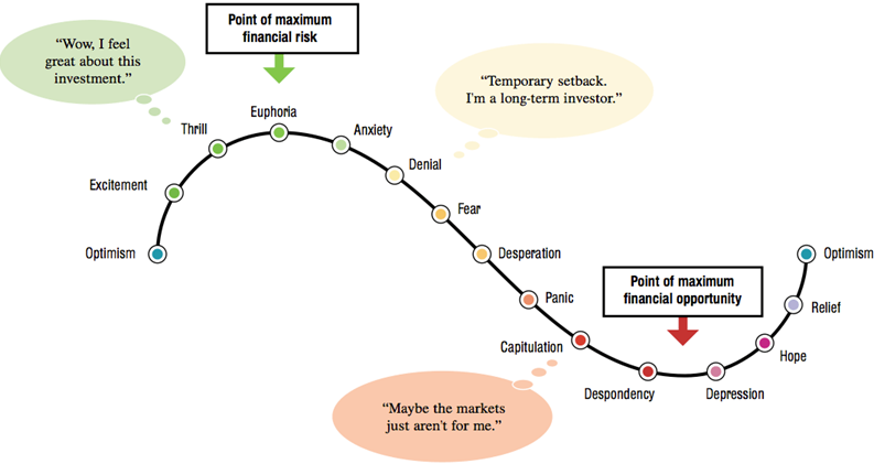 Lorsque l’on regarde le cycle émotionnel de l’investisseur, graphique que l’on connaît bien qui affiche, dans l’ordre : euphorie, anxiété, déni, peur, désespoir, panique, découragement et dépression – avant de repasser à l’espoir et au soulagement et l’optimisme, on se rend bien compte qu’aujourd’hui nous sommes quelque part dans la zone de la panique et du découragement. Peut-être pas encore en phase de découragement, puisque l’on entend encore trop de monde qui revendique la patience et le fait que « soudainement » ils sont devenus des investisseurs « long terme », alors qu’il y a six mois, ils étaient venus en bourse pour devenir riches avant l’été, acheter une Lamborghini Aventador et partir frimer sur la Côte d’Azur. À ce stade-là, on peut encore se dire qu’il y a un peu de chemin à faire avant de capituler complètement et de passer au découragement.