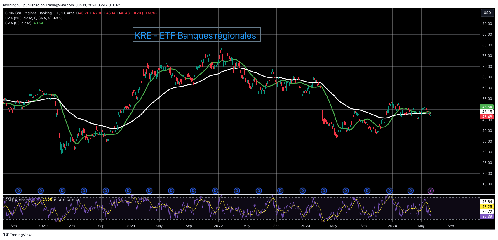 En gros, l’annonce d’hier n’a pas fait vibrer les investisseurs (sauf Dan Ives qui estime que c’est un HOME RUN pour Apple), et le titre terminait la séance en baisse de 1.91%. Affaire à suivre, j’imagine bien que nous allons décortiquer toutes les annonces en détails, mais hier soir, si l’on devait résumer la chose : c’était plutôt chiant. Pour le reste, on a pas mal causé de ce qui pourrait se passer entre mercredi matin et mercredi soir et on entend des voix s’élever pour dire que la FED DOIT AGIR sur les taux, sinon on va sombrer dans la dépression, mais pour espérer cela, il faudra que Powell reconnaisse que l’économie est « presque » mal en point et que le Soft Landing pourrait rapidement se transformer en « hard landing ». Néanmoins, on n’est pas sûr qu’il puisse s’autoriser à penser ça à 5 mois des élections. Et puis, dans un autre sujet dont presque personne ne parle, je vous recommande de vous intéresser aux ETF sur les banques régionales. Le KRE, par exemple, est au bord du gouffre – un peu comme les 63 banques régionales américaines qui se trouvent financièrement au même endroit. On n’en parle que très peu, mais chaque jour qui passe avec des taux trop élevés, les 63 banques en question s’approchent un peu plus d’une petite séance de base jump, mais sans parachute.