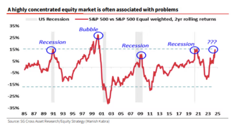 Du côté des nouvelles, je crois que tout est dit, on notera encore qu’Edwards de la SocGen vient de publier son nouveau rapport qui dit qu’on va tous mourir. Edwards c’est l’inventeur du krach boursier et le plus bearish des mecs qui existe sur la planète. Je pense que si le Nasdaq baissait de 99%, il se plaindrait encore en estimant que c’est surévalué. Ceci dit, pour le moment, il a réussi à nous pondre un chart sur lequel il pointe du doigt le fait que, dans l’histoire, chaque fois qu’il y a eu une hyper-concentration de titres dans un indices, la récession est arrivée et le marché s’est planté. Pas besoin d’en dire plus quand on sait que 10 membres du S&P représentent 37% du poids de l’indice. Il n’a pas précisé de target dans son rapport mais 30% de baisse, pour lui, c’est une correction technique. Mis à part ça, on parle toujours obésité dans les médias, puisque Eli Lilly et Novo Nordisk se sont encore pris des claques à cause de la concurrence qui arrive. Et la concurrence, a terminé en hausse après une belle journée de swing en Suisse, puisque le Bon Roche est dorénavant dans le viseur des experts en médicaments contre l’obésité.